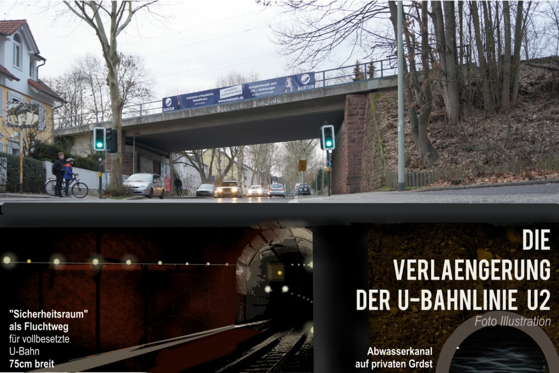 Foto und Illustration - Kirsten Baum, Bad HomburgU-Bahn im 1-gleisigen U-Bahnschacht bei der Durchfahrt unterhalb der S-Bahnbrücke Frankfurter Landstraße