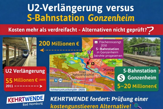 Sollte sich das Bauvorhaben der unterirdischen Verlängerung der U-Bahnlinie U2 zum Bahnhof Bad Homburg zerschlagen, kämpfen wir für eine verkehrlich sinnvolle, schnelle und bezahlbare Alternative.
